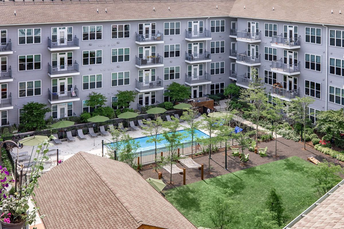 A timber-framed portico greets residents as they enter. Slats of reclaimed shiplap line the walls of the amenity space. Overhead, planks sourced on-site and milled in Connecticut stretch across the ceiling. Bright, midcentury modern furniture and a collection of cookbooks and antique copper pots create a sense of simple charm and lived-in comfort. Outside, the courtyard "Grill-zebo" boasts a grilling setup fit for competition barbecue.