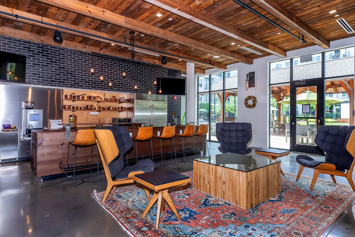 - Modern Farmhouse Style Amenity Space featuring Midcentury Modern Furniture, Vintage Oriental Rugs, Custom-built Wet Bar, and Event Space